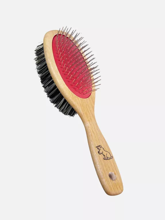 Dubbelsidig hundborste i bokträ – för kort och lång päls