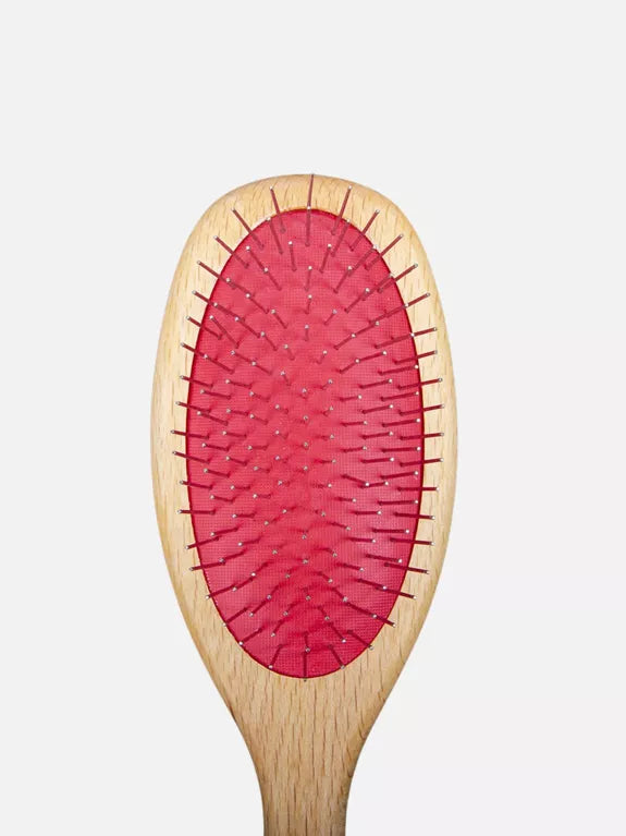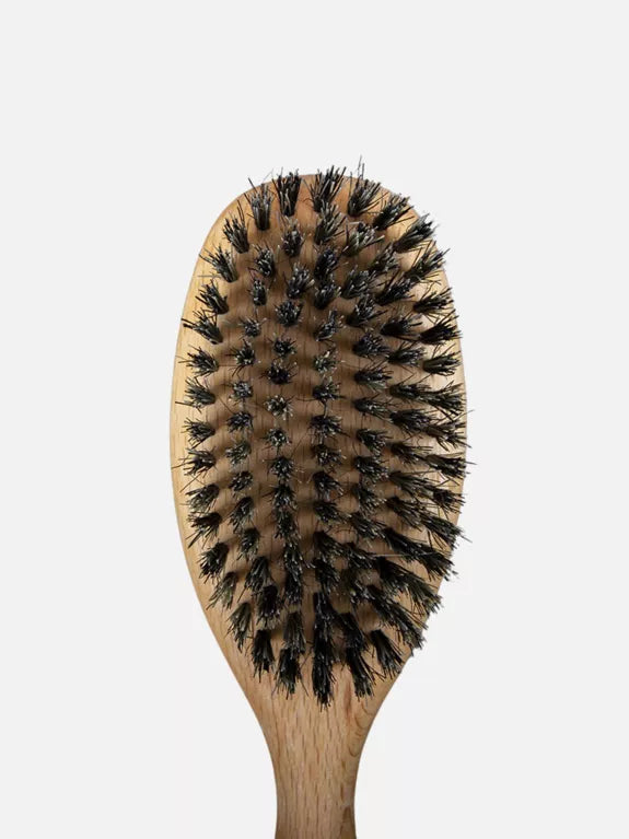 En karda har ofta vassa piggar, medan denna borste är skonsam och passar daglig användning utan att irritera huden.